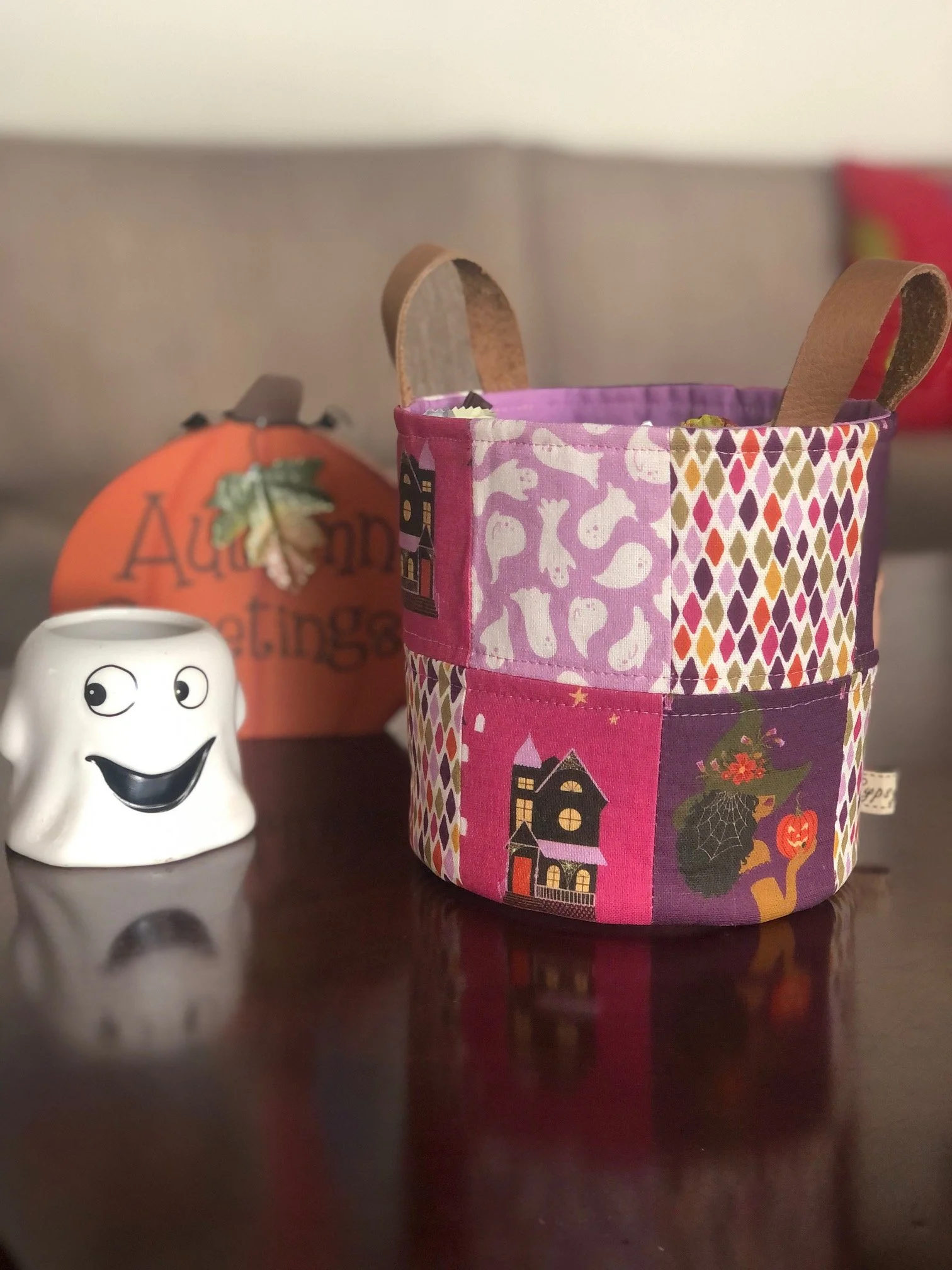 You can also mix prints like an allover print and prints with single designs, like I did with my basket. For example the print of the ghosts and diamonds are an allover print, the haunted houses and the witches have single motifs perfect for fussy cutting. Mixing different prints, I think, gives your project a nice movement.